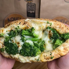 Pão baguete de parmesão recheado com pasta de alho artesanal, brócolis salteados e queijo muçarela gratinado.